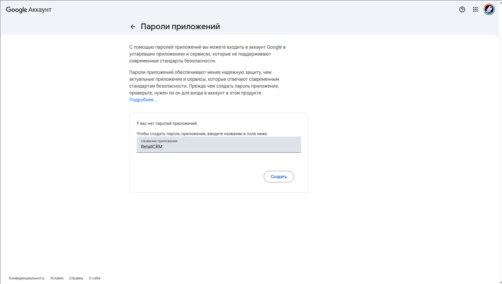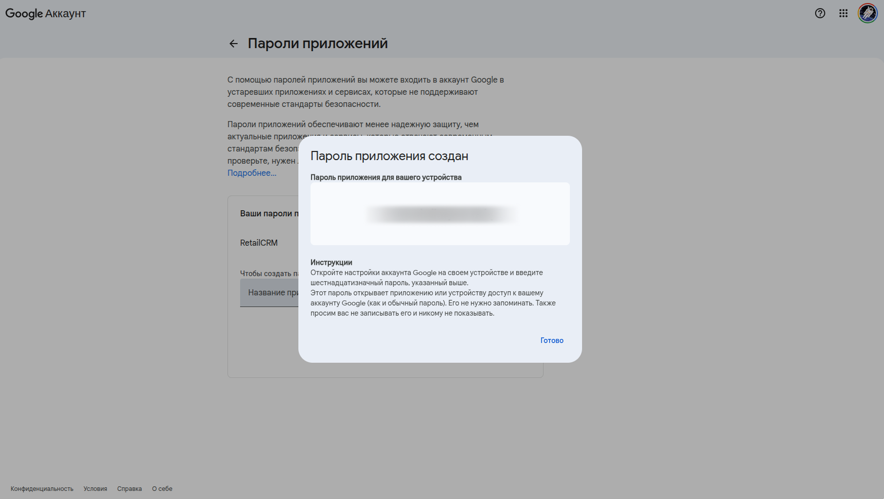 RetailCRM), чтобы в дальнейшем понимать, для чего используется данный пароль, и нажмите кнопку «Создать».