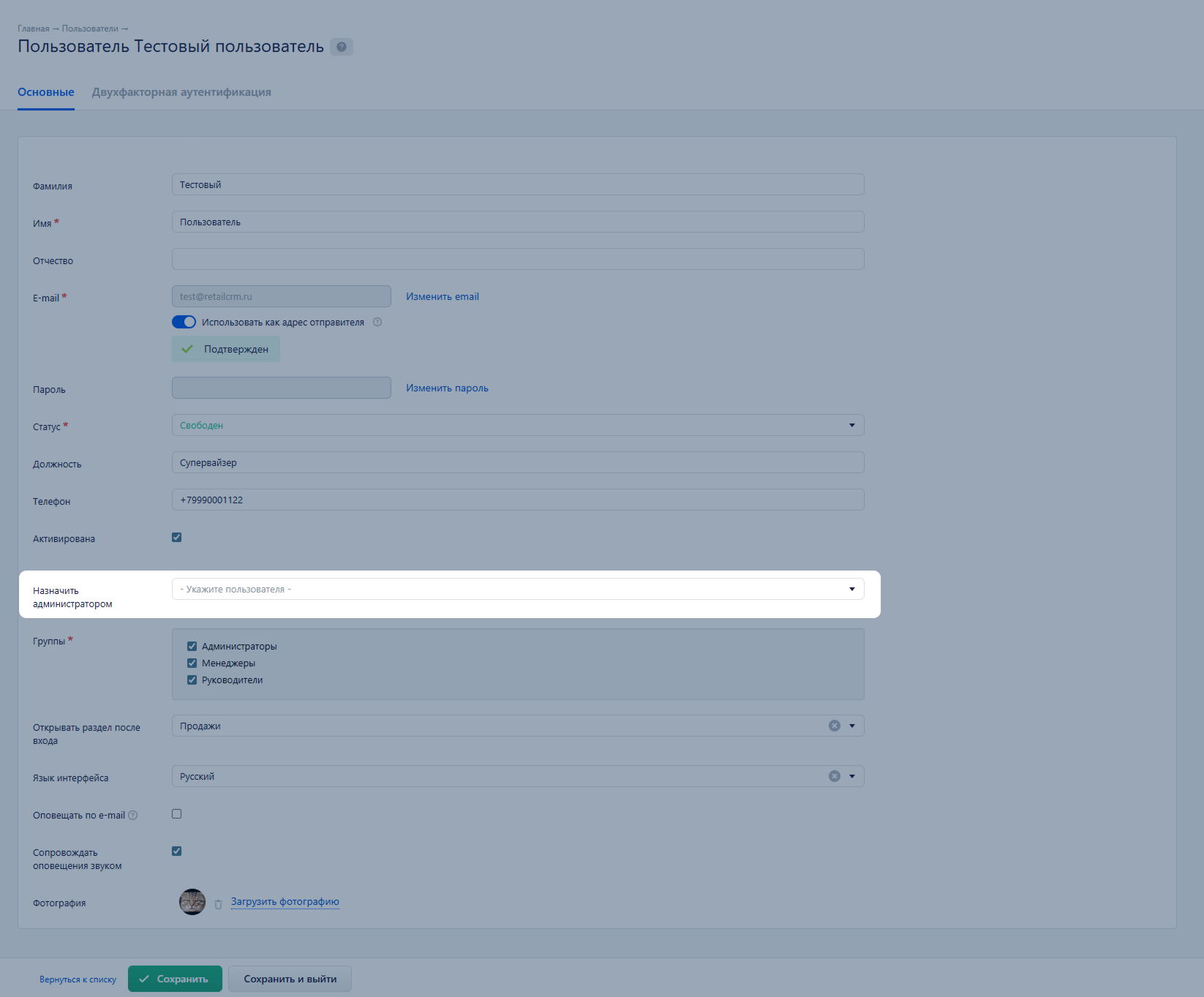 Если попытаться отключить опцию «Активный» или снять отметку «Администратор» у последнего администратора, система предложит назначить другого администратора и только после этого позволит сохранить изменения.