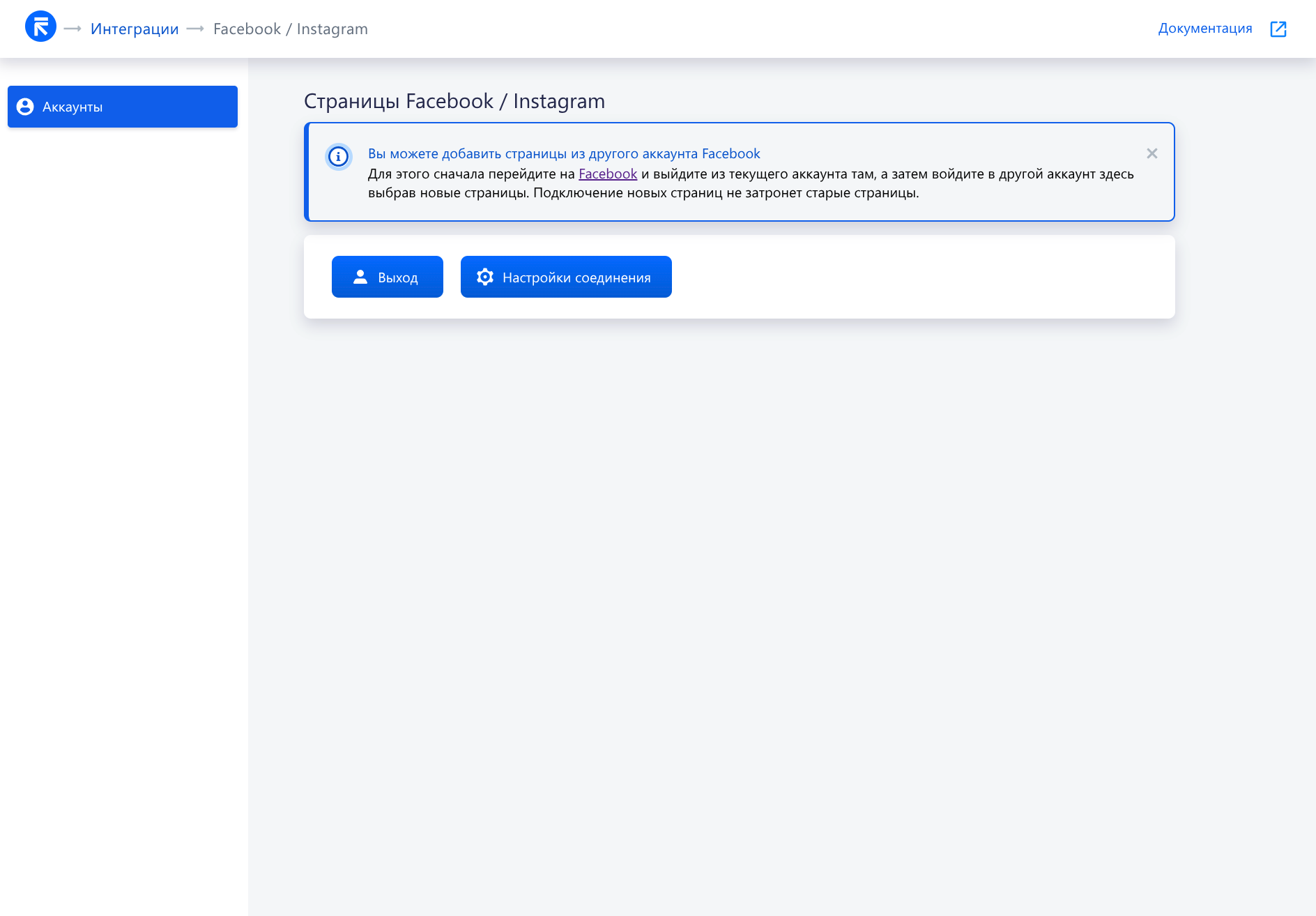 Кнопка Выход на странице настроек модуля обнуляет токены всех подключенных аккаунтов Facebook и деактивирует соответствующие каналы в системе. Кнопка не выполняет выход из аккаунта Facebook в браузере — если необходимо авторизоваться под другим пользователем, выйдите из Facebook отдельно в окне браузера.