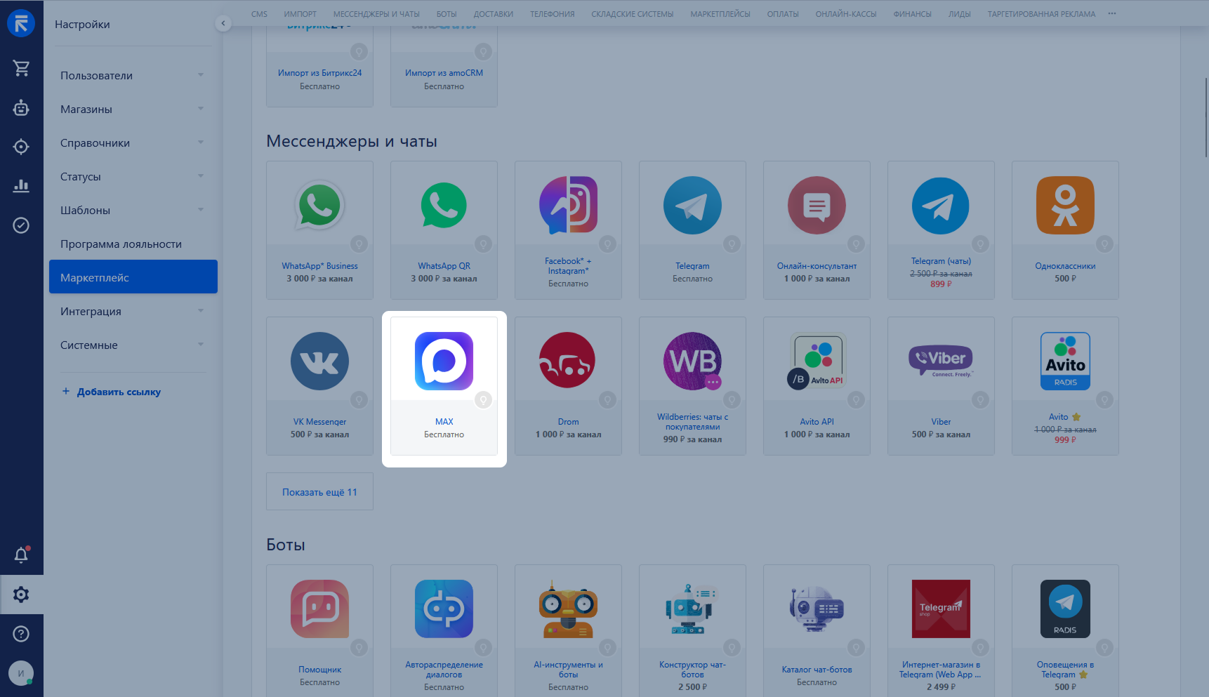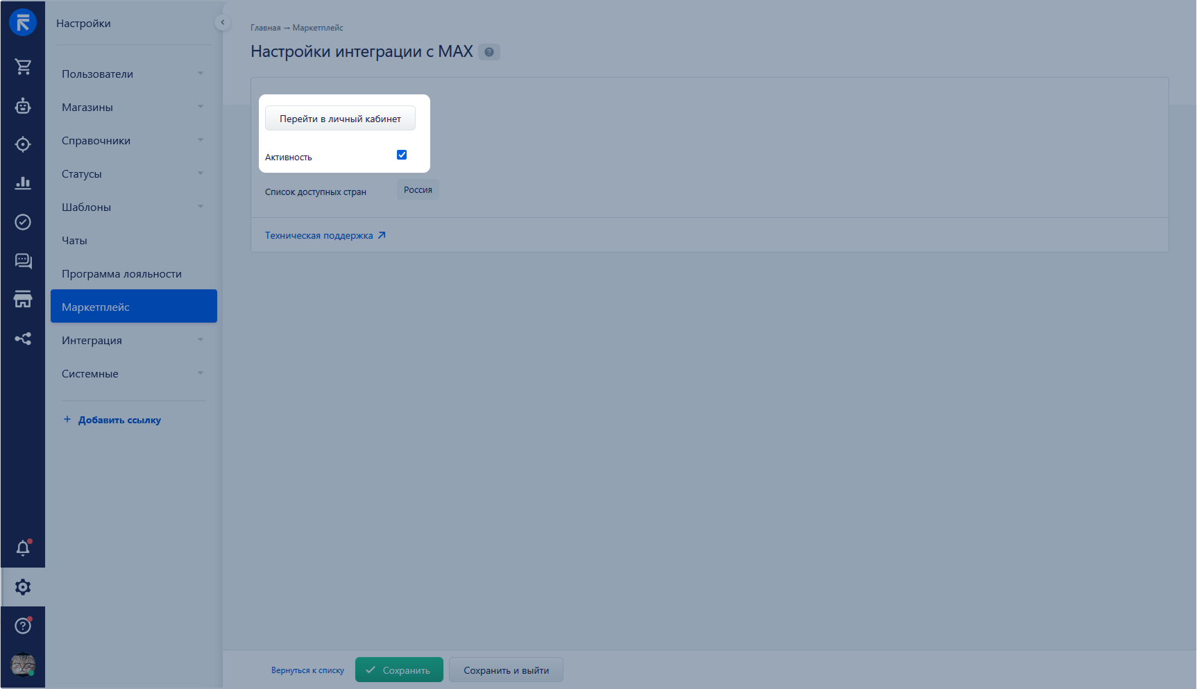Перейдите в раздел «Маркетплейс» в RetailCRM → выберите модуль «MAX» → «Перейти в личный кабинет»