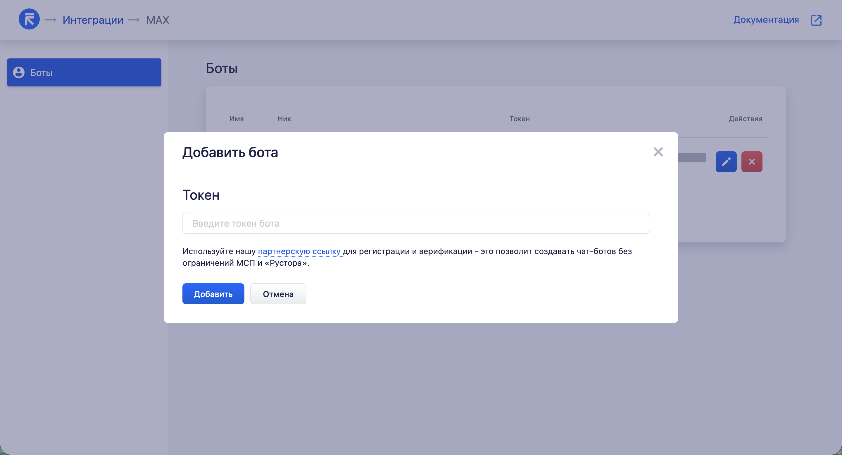Нажмите «Добавить бота» → вставьте скопированный токен вашего бота в поле «Токен» и нажмите кнопку «Добавить»