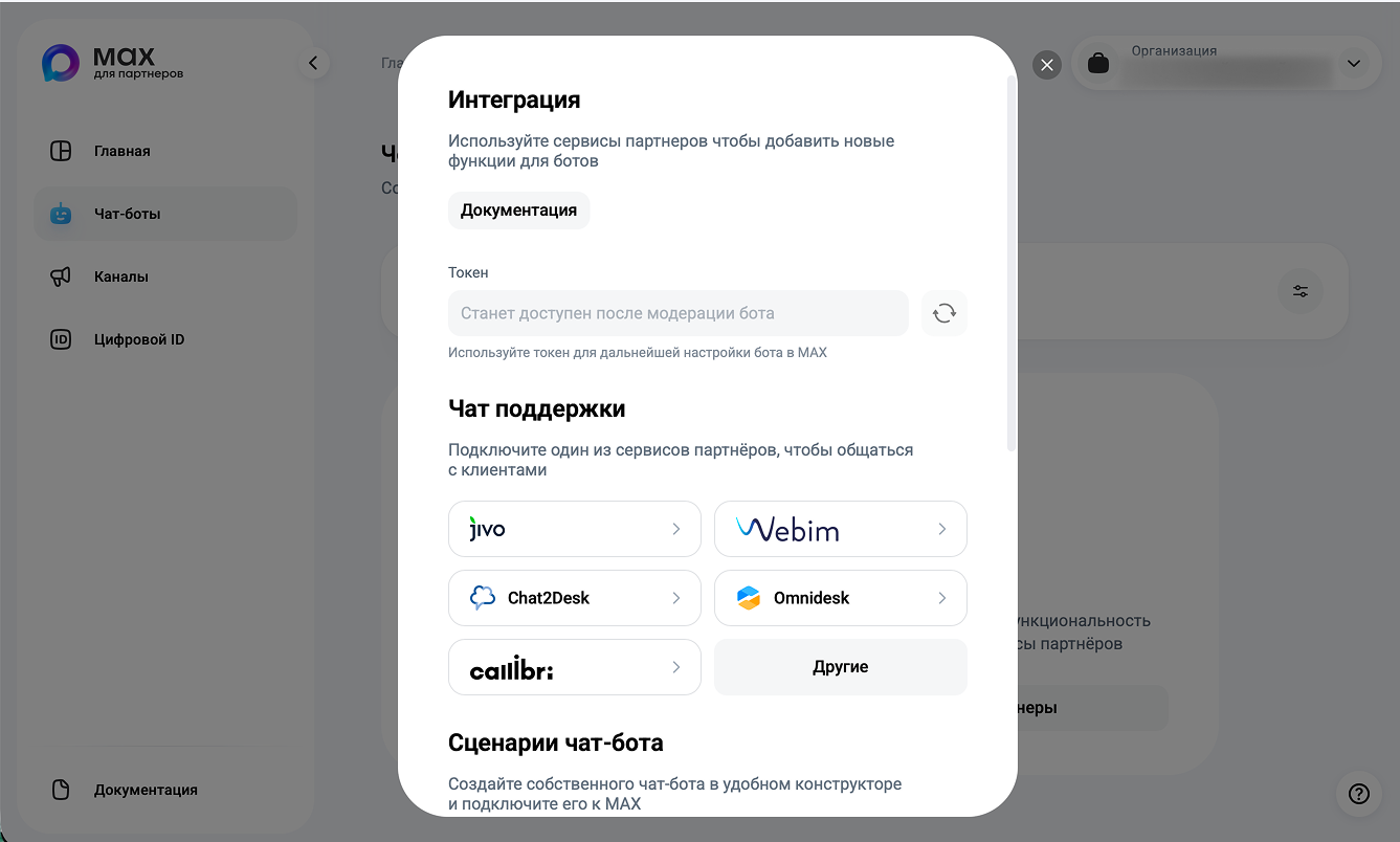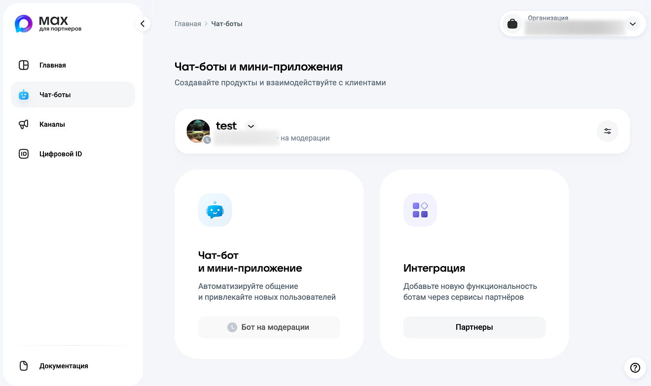 - На стороне MAX пройдите регистрацию, верификацию организации и создайте чат-бота.