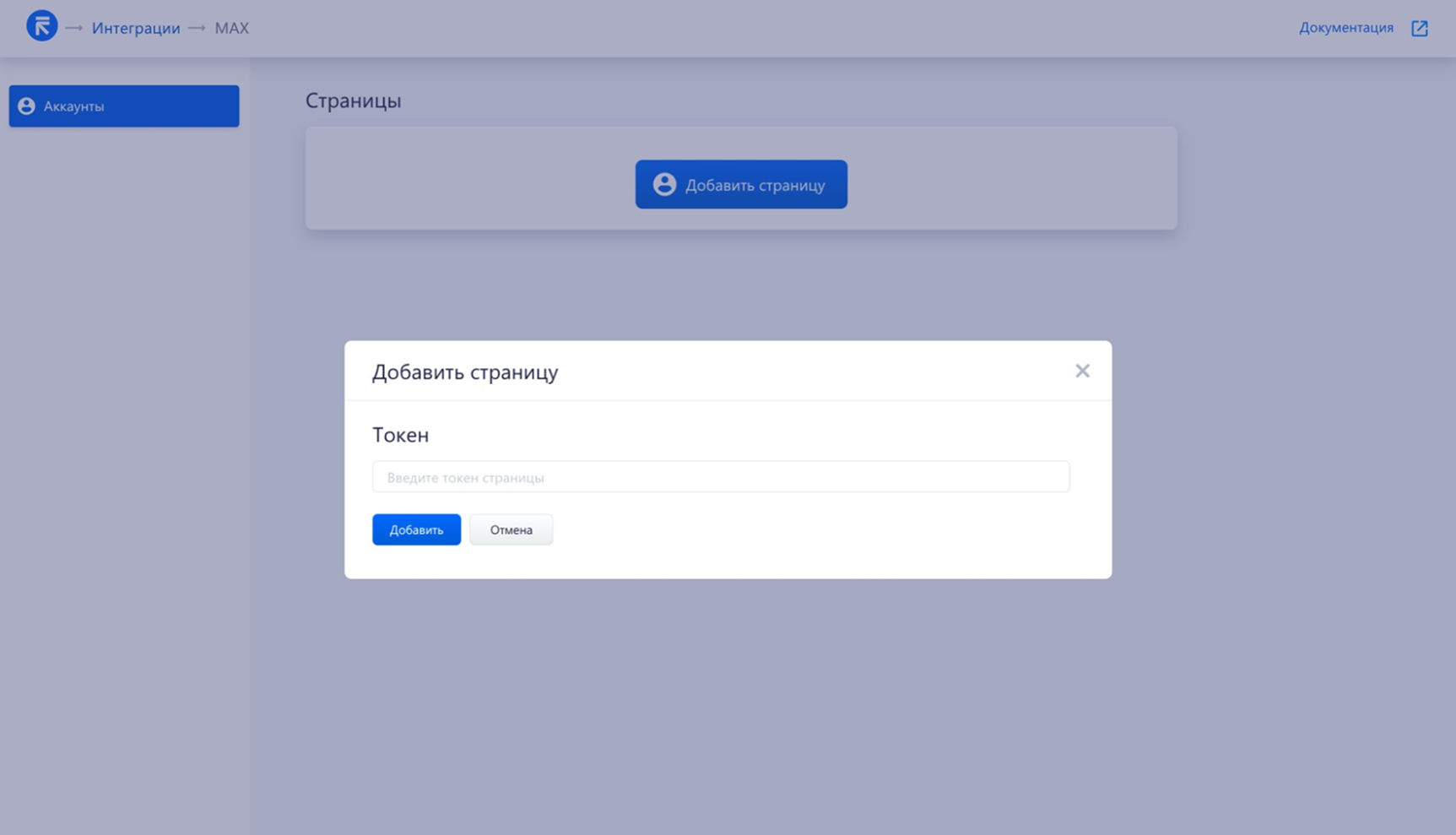 Нажмите «Добавить страницу» → вставьте скопированный токен вашего бота в поле «Токен» и нажмите кнопку «Добавить»