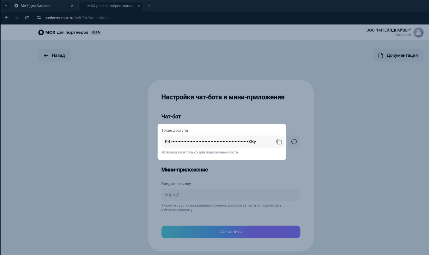 Токен - это уникальный ключ, который необходим для связи вашего бота в MAX с нашей платформой. Он генерируется автоматически после того, как бот пройдет модерацию.