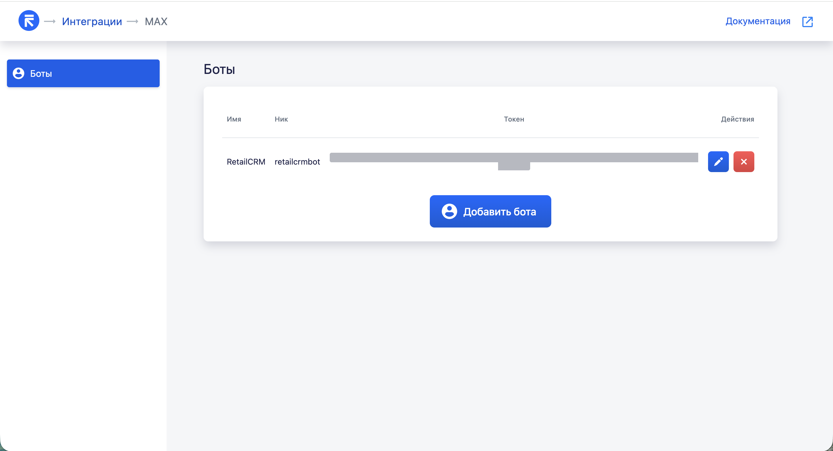 Если после подключения бота его название было изменено на стороне MAX, в RetailCRM новое название не обновится автоматически. Чтобы в системе отобразилось актуальное название бота, необходимо удалить его из модуля MAX и добавить заново.