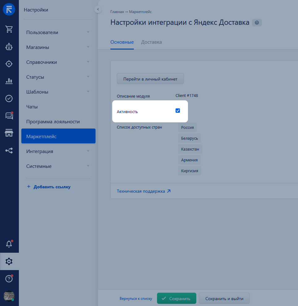 - В настройках модуля на вкладке «Основные» проставьте чекбокс «Активность».