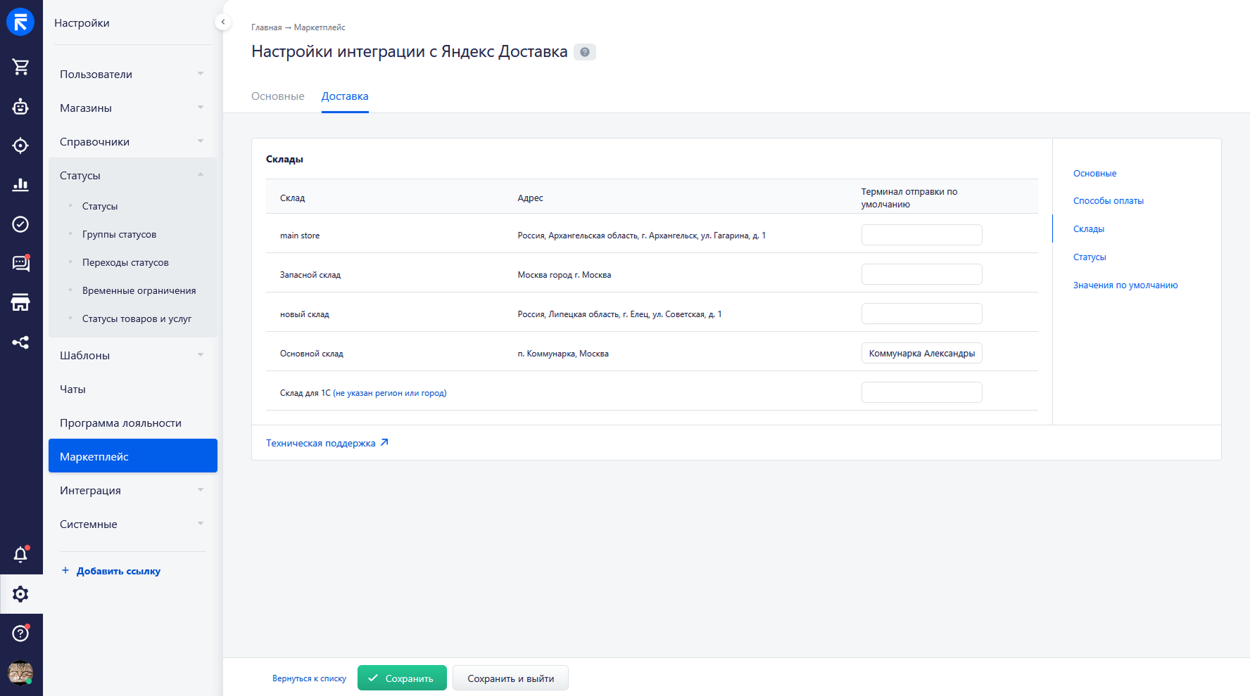 - Укажите адрес для существующих складов отгрузки по пути Настройки → Магазины → Склады.