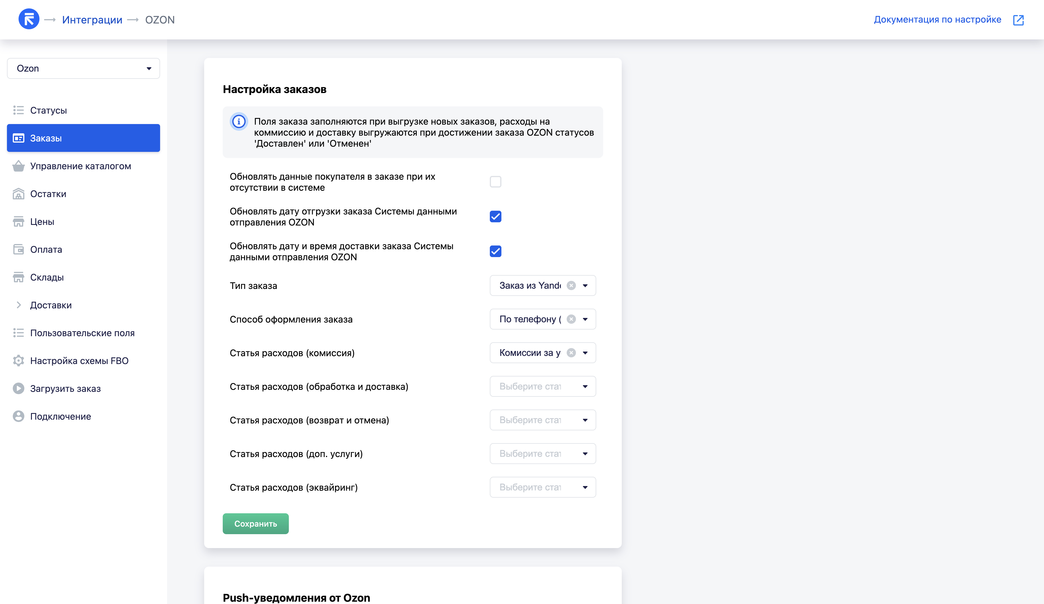 На данном шаге можно настроить обновление данных покупателя, даты отгрузки, дату и время доставки в заказе Системы данными из отправления OZON, тип и способ оформления заказа, а также выгрузку расходов.