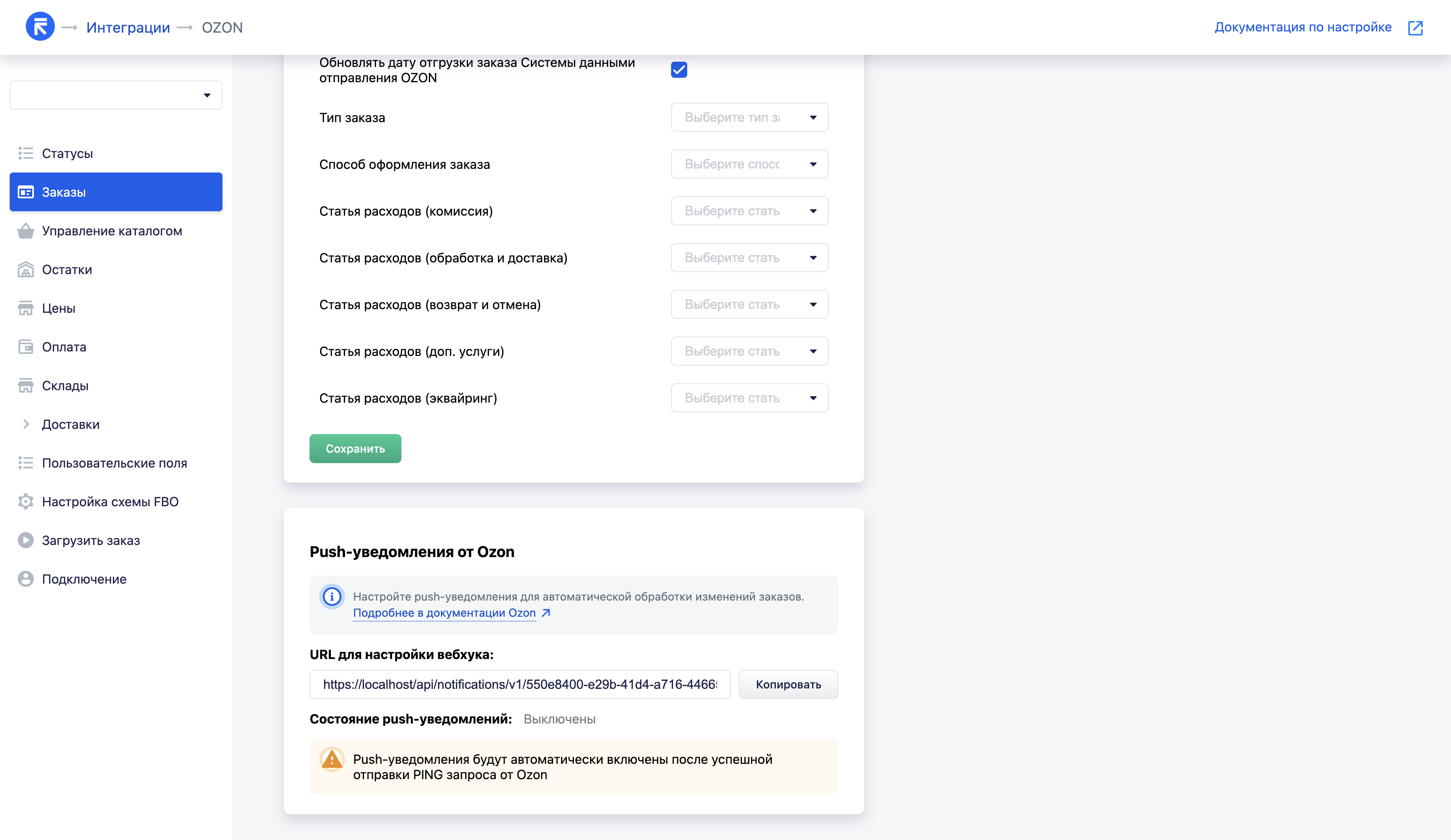 После сохранения Ozon отправит тестовый PING-запрос, модуль автоматически активирует push-уведомления, и статус изменится на «Включены». Периодический опрос заказов будет автоматически отключен.