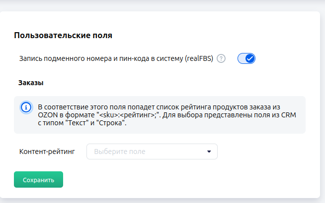 Запись подменного номера и пин-кода в систему (realFBS)" - при активации, создает в системе 2 пользовательских поля Подменный номер телефона (Ozon RFBS) и Пин-код (Ozon RFBS) для записи подменных номеров телефонов и пин-кодов для realFBS заказов.