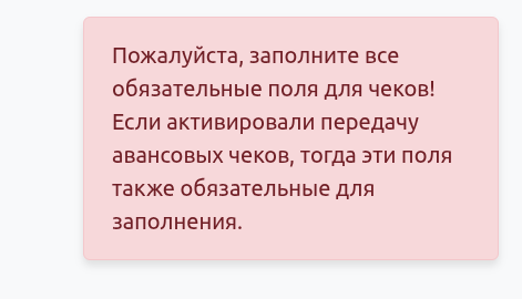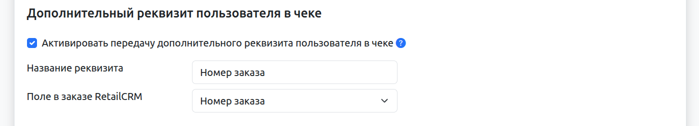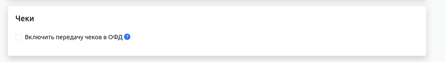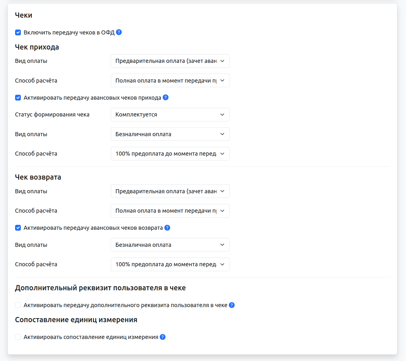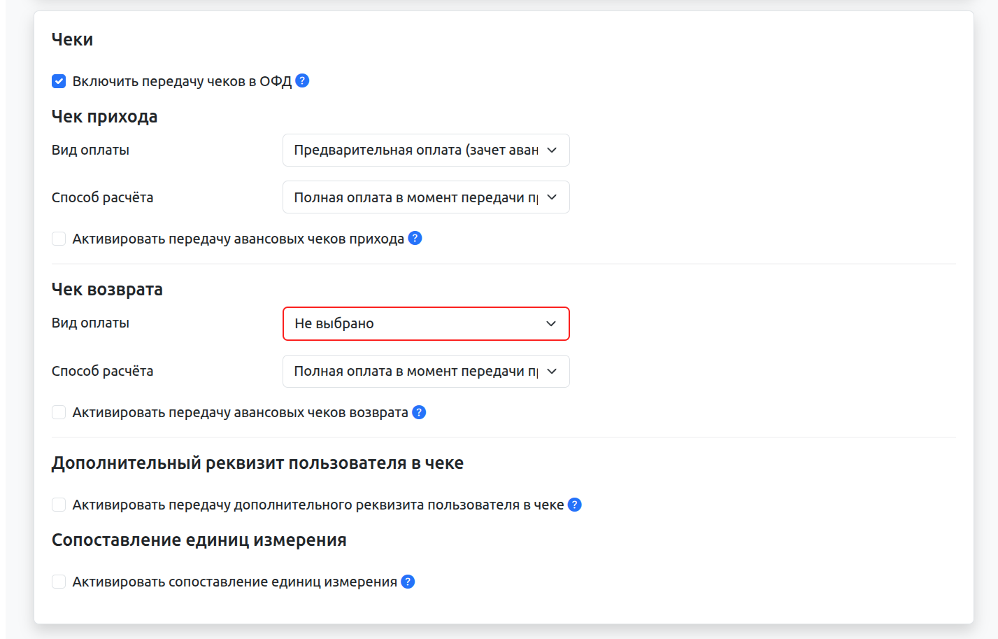 Если передача чеков включена, необходимо выбрать значения во всех полях этого блока. Иначе сохранить настройки будет невозможно.