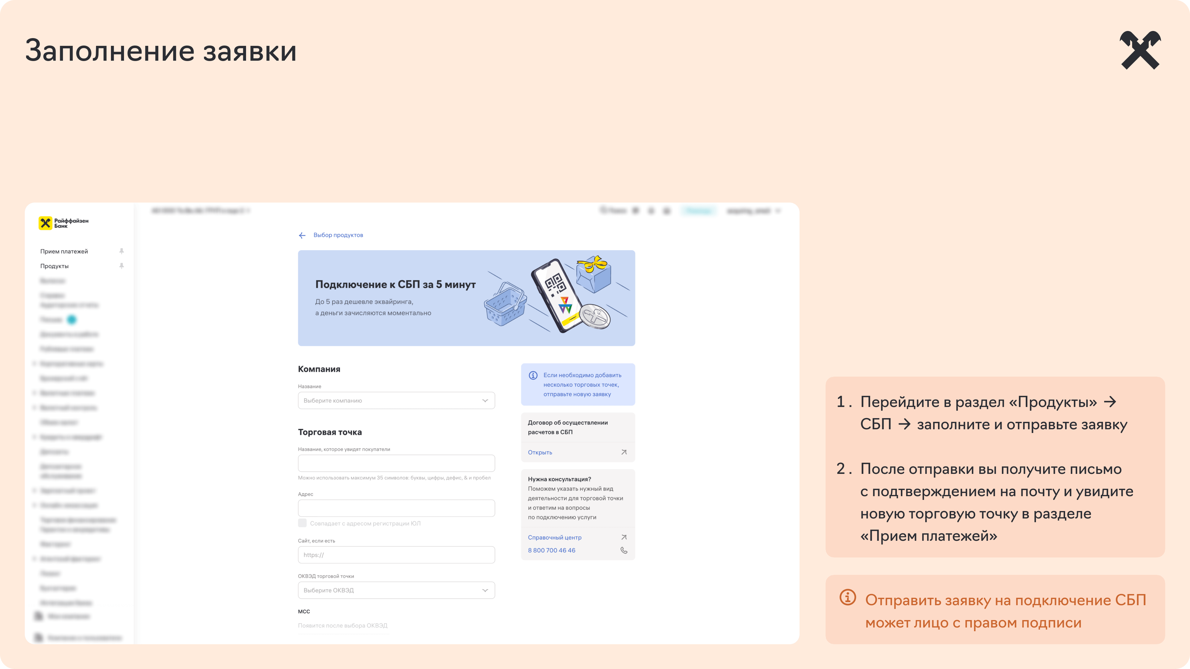 Заявку на эквайринг или СБП отправляет лицо с правом подписи.