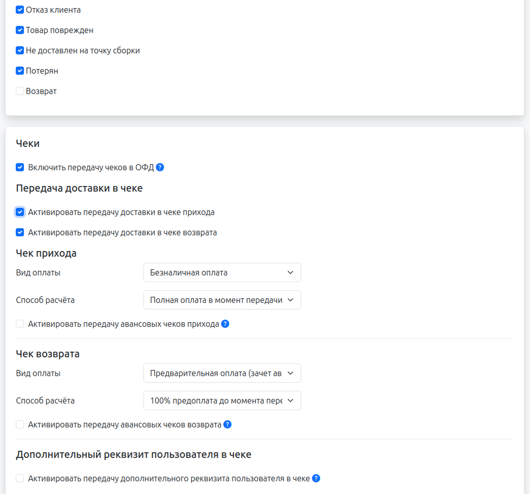 Для передачи стоимости доставки в фискальных чеках необходимо включить соответствующие опции в конфигурации чеков: