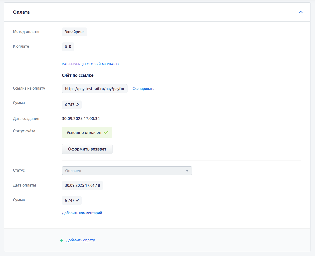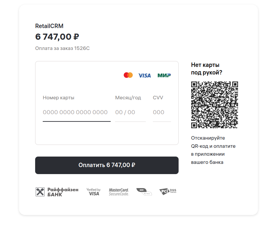 После оплаты Raiffeisen отправляет уведомление в сервис, данные по оплате автоматически синхронизируются с оплатой в CRM.