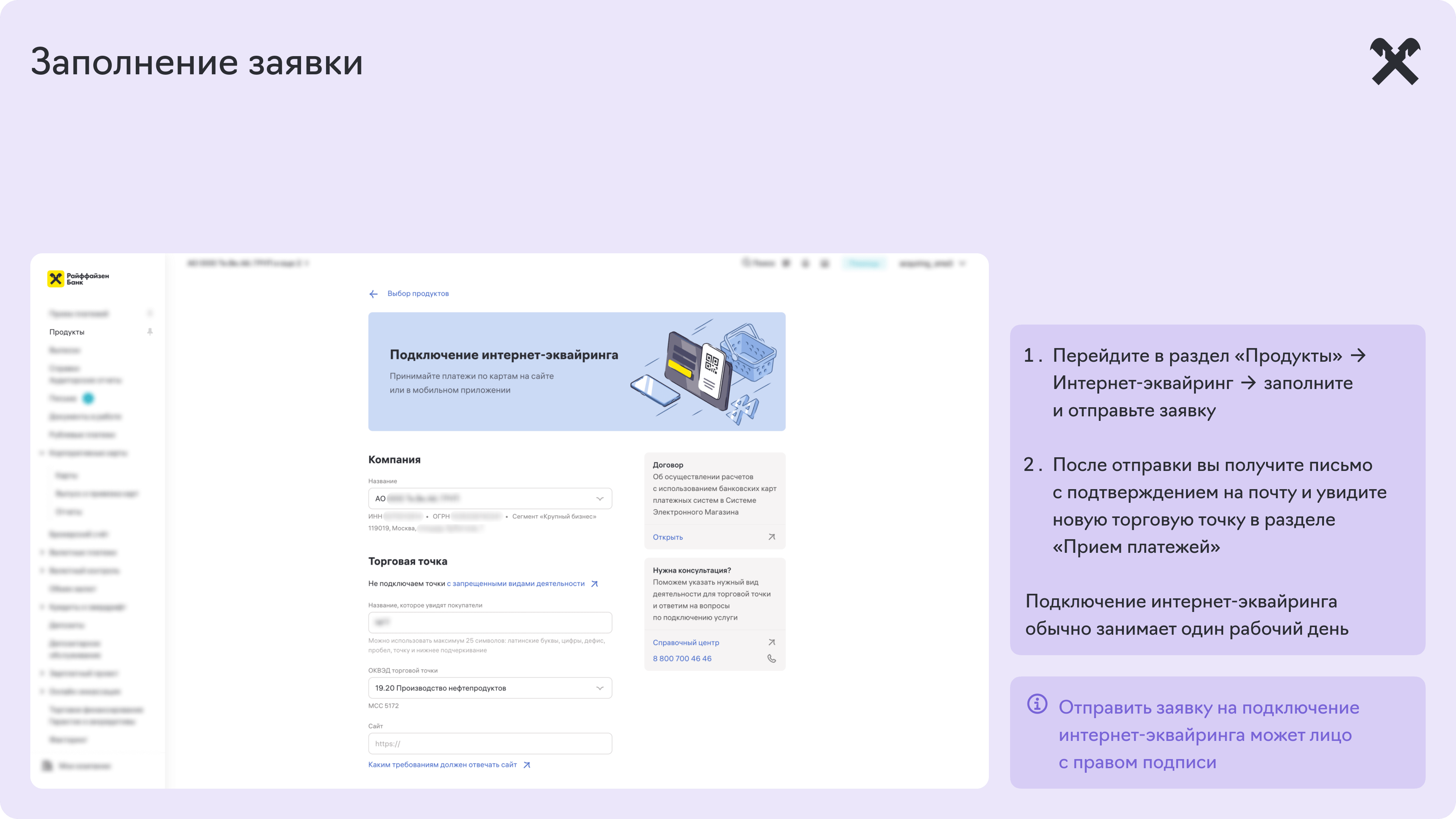 Для подключения интернет-эквайринга нужно перейти в «Сервисы» → «Интернет-эквайринг» и заполнить заявку. После отправки придёт подтверждение на почту, а в разделе «Приём платежей» появится новая торговая точка. Подключение обычно занимает один рабочий день.