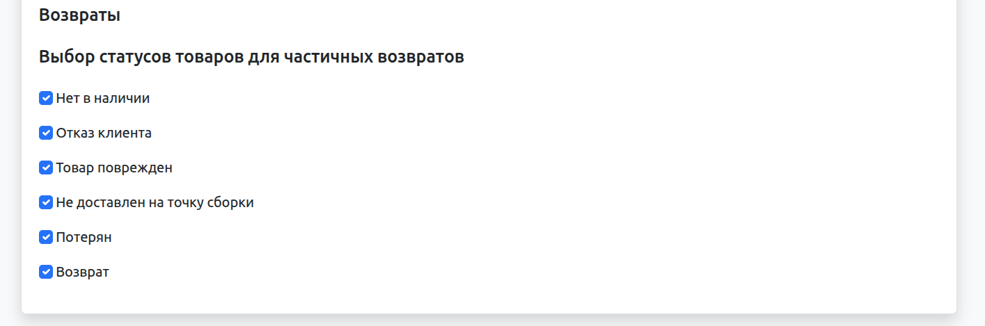 В настройках сервиса задаются статусы товара для частичного возврата. Когда товар переведён в такой статус, в течение 5 минут для него сформируется чек на частичный возврат.