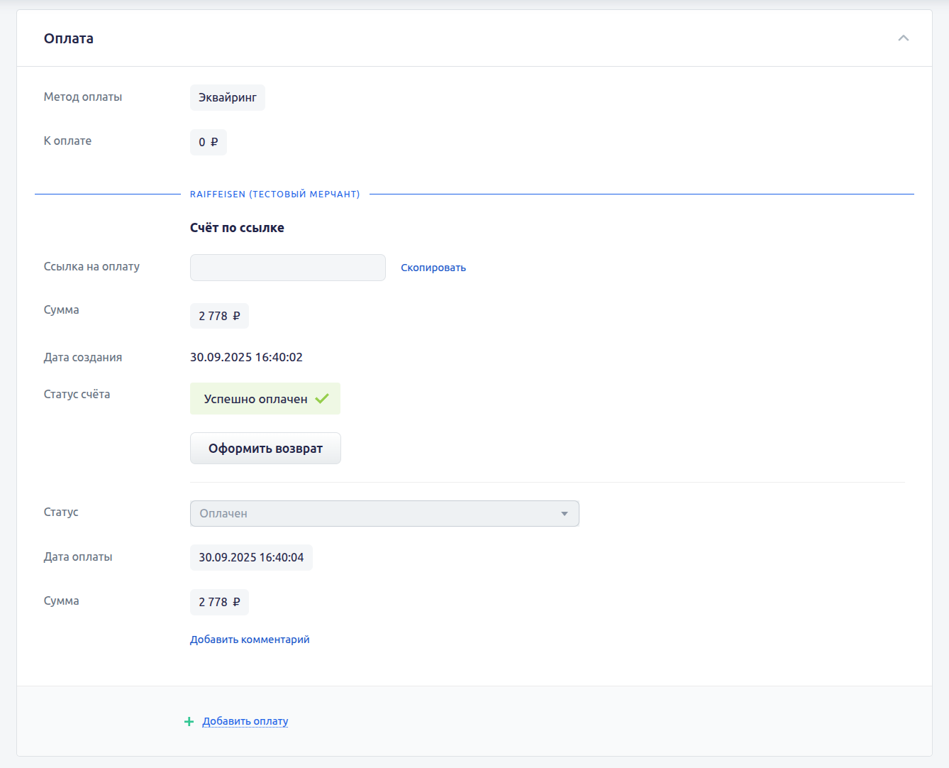 - Отмена - платёж ещё не был оплачен. В сервисе можно многократно генерировать ссылку на оплату, отменить текущую и создать новую ссылку в заказе CRM. При попытке отменить уже оплаченный платёж, например, через статус заказа, будет выполнен возврат.