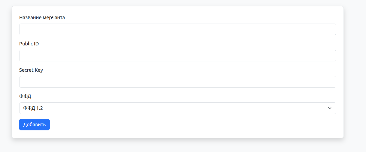 После подключения необходимо добавить ваши учетные данные. Откройте вкладку Мерчанты и нажмите Добавить. Откроется форма для заполнения.
