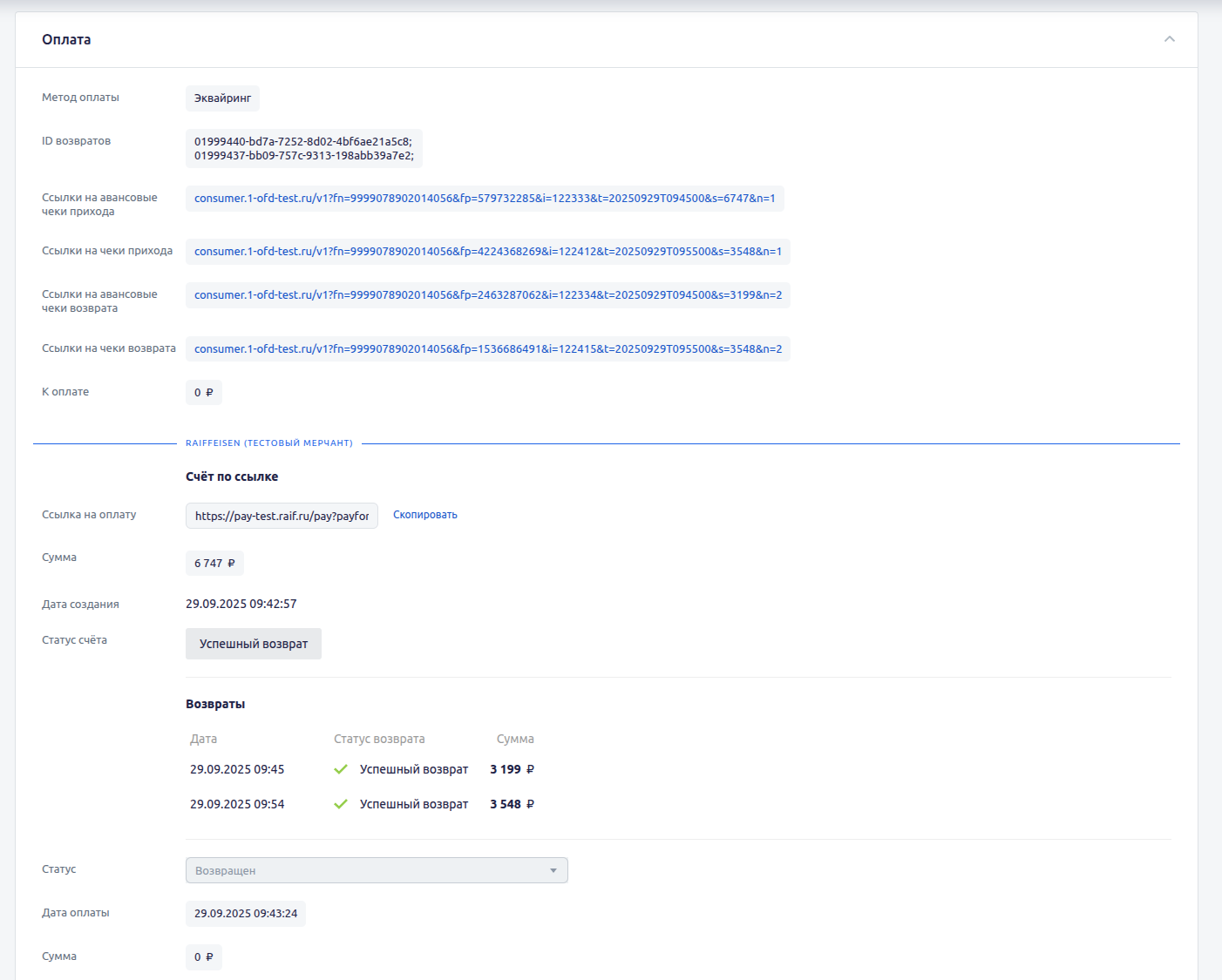 - Статус отмены - логика зависит от состояния платежа: если он не оплачен, он отменяется в Raiffeisen; если оплачен - выполняется полный возврат и формируется чек возврата.