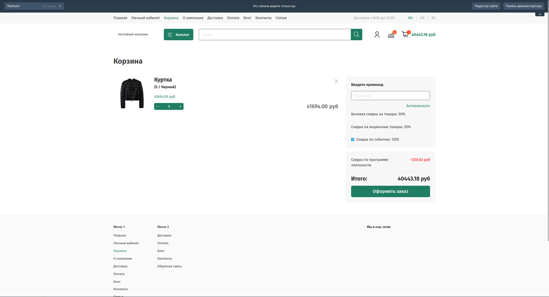 Теперь, в зависимости от того, как настроена Программа лояльности, покупатель будет видеть при оформлении заказа в корзине либо размер автоматически рассчитанной и примененной скидки, либо количество баллов доступных для списания в виде скидки на заказ.