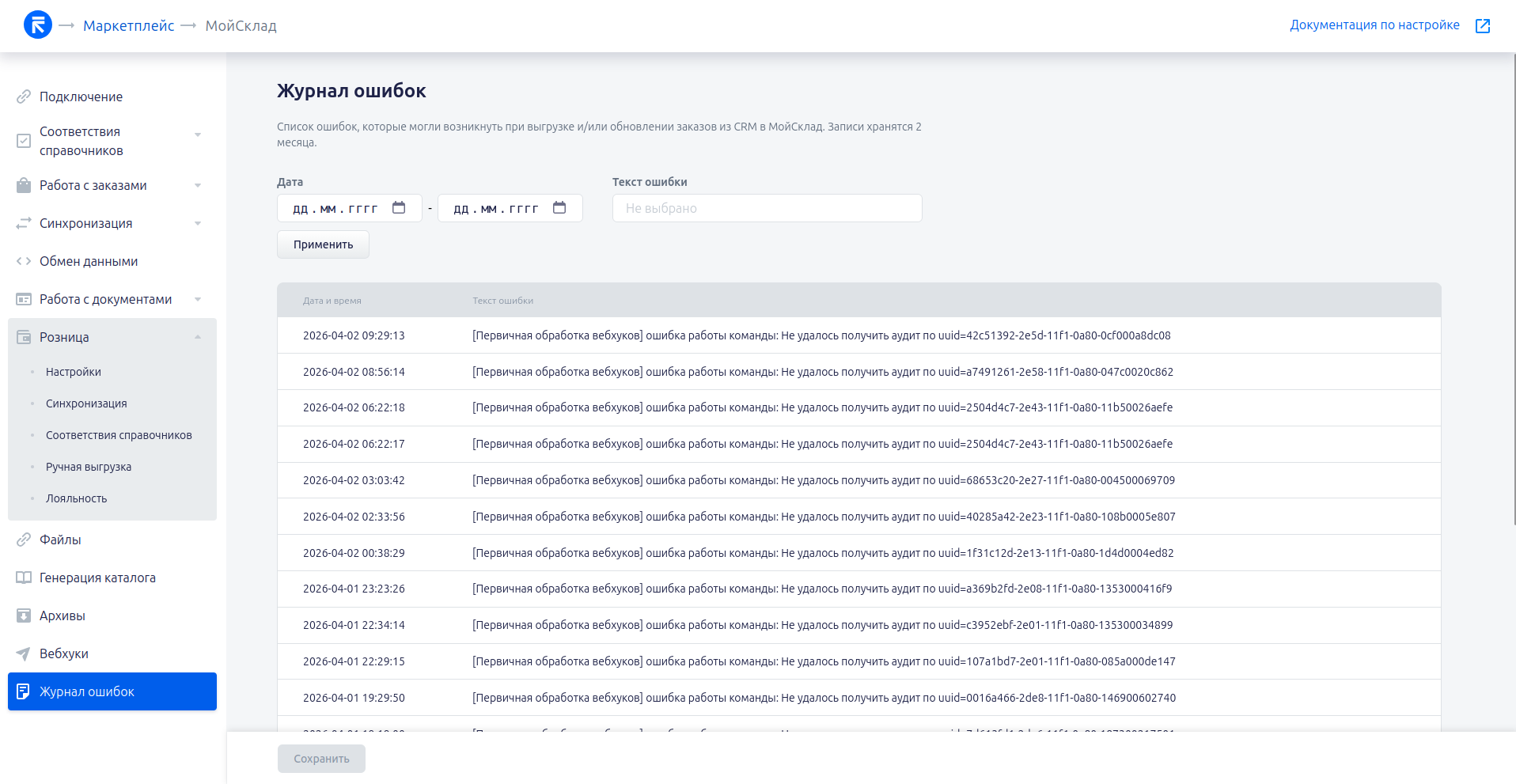 Во вкладке «Журнал» возможно просмотреть список ошибок, которые могли возникнуть при выгрузке и/или обновлении заказов из CRM в МойСклад.