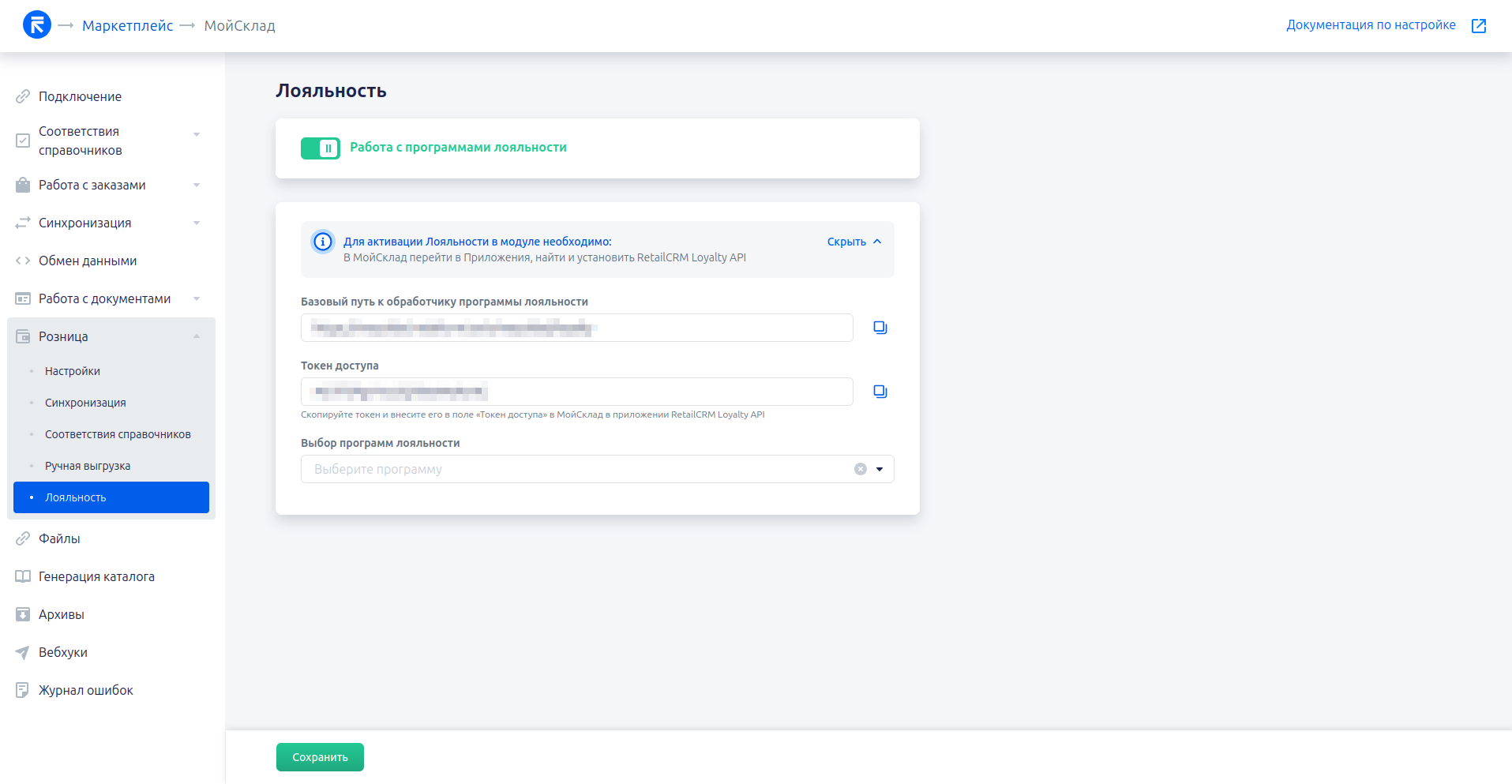 - «Токен доступа» — требуется для настройки приложения лояльности на стороне МойСклад. Нужно скопировать и внести токен в приложении «RetailCRM | Интеграция с программой лояльности»