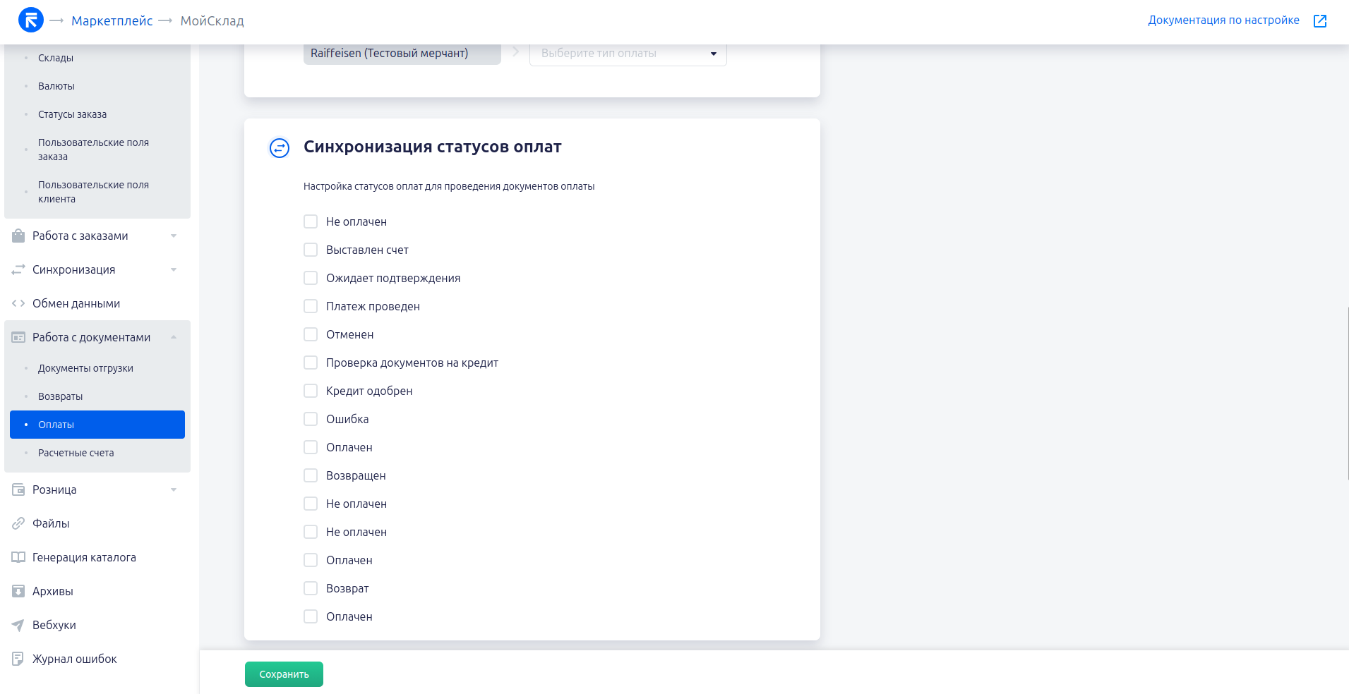 Во вкладке «Синхронизация платежных документов» настраивается синхронизация по платёжным документам отдельно для двух типов - приходный ордер и входящий платёж.