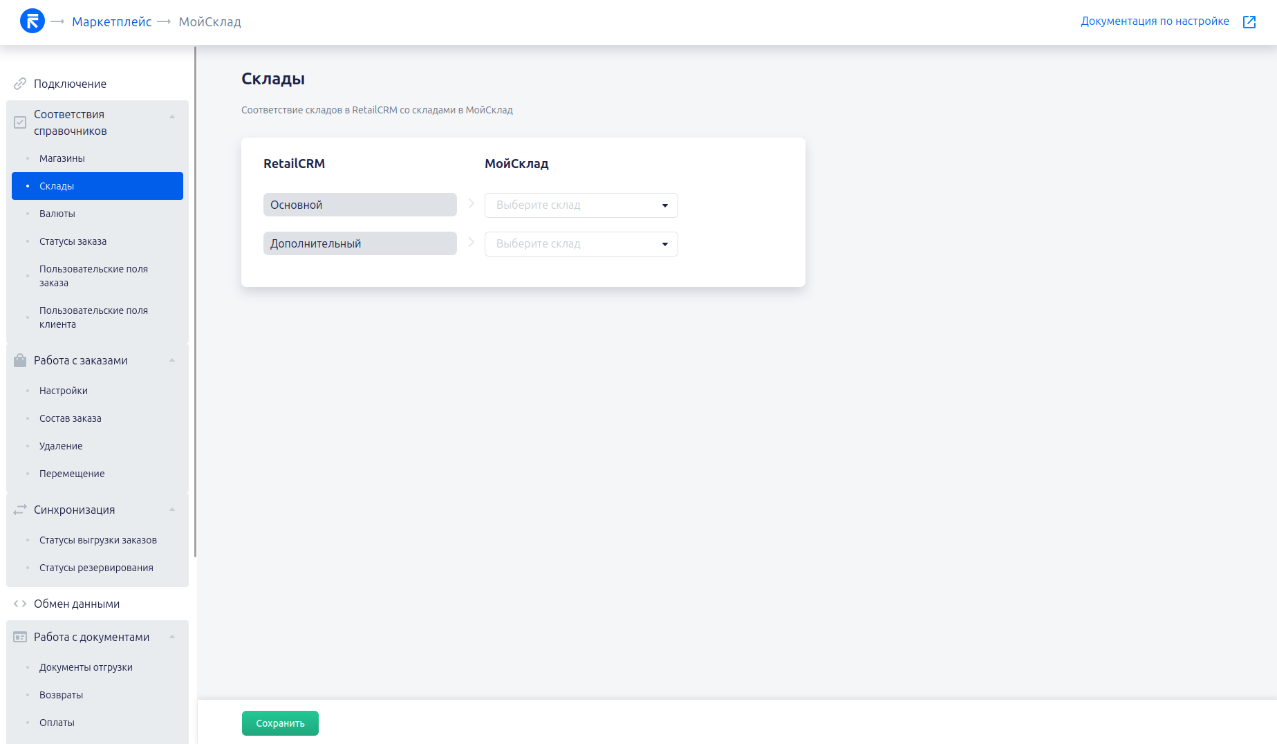 Во вкладке «Склады» необходимо настроить соответствие складов системы и МойСклад.