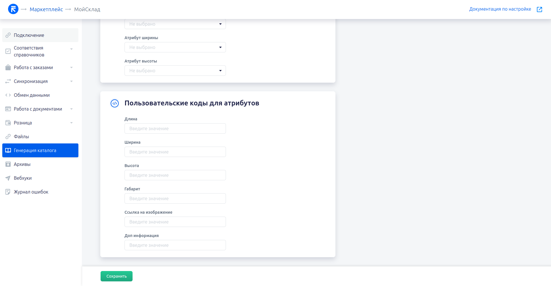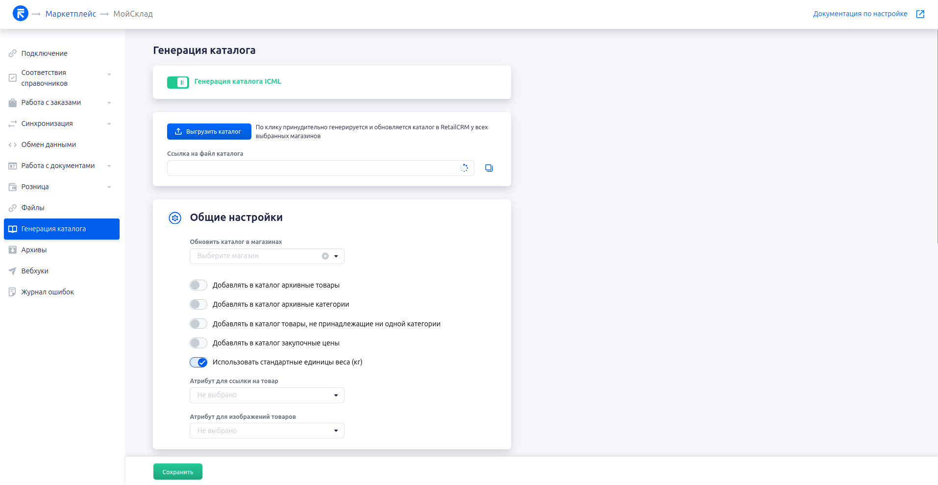 Кнопка Загрузить каталог позволяет без пересохранения настроек сразу же добавить задачу по генерации каталога в очередь. Будет полезно, если изменился список товаров в МойСклад, и надо срочно обновить файл каталога на сервере.