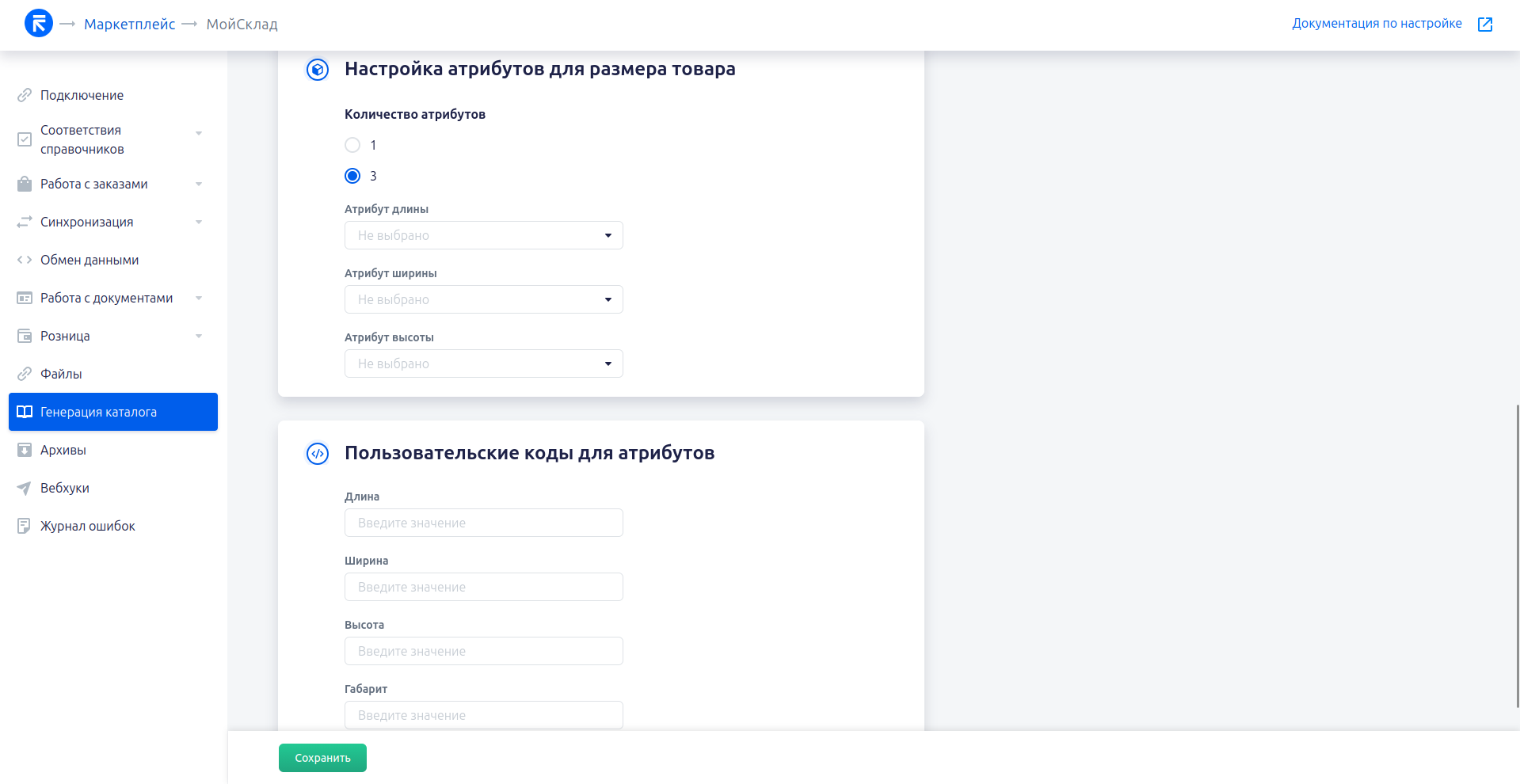 Настройки атрибутов для размеров товара