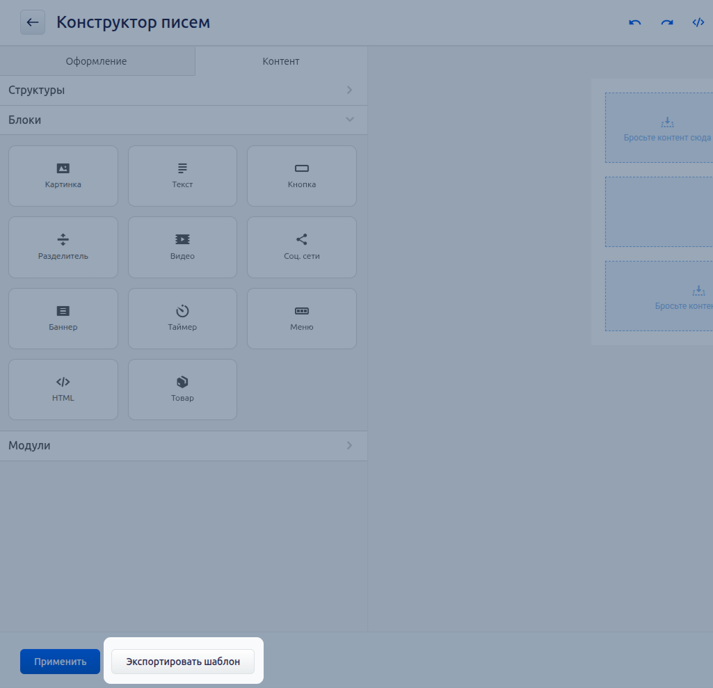 Если вы планируете продолжить работу с текущим макетом в другом конструкторе писем, вы можете выгрузить его: