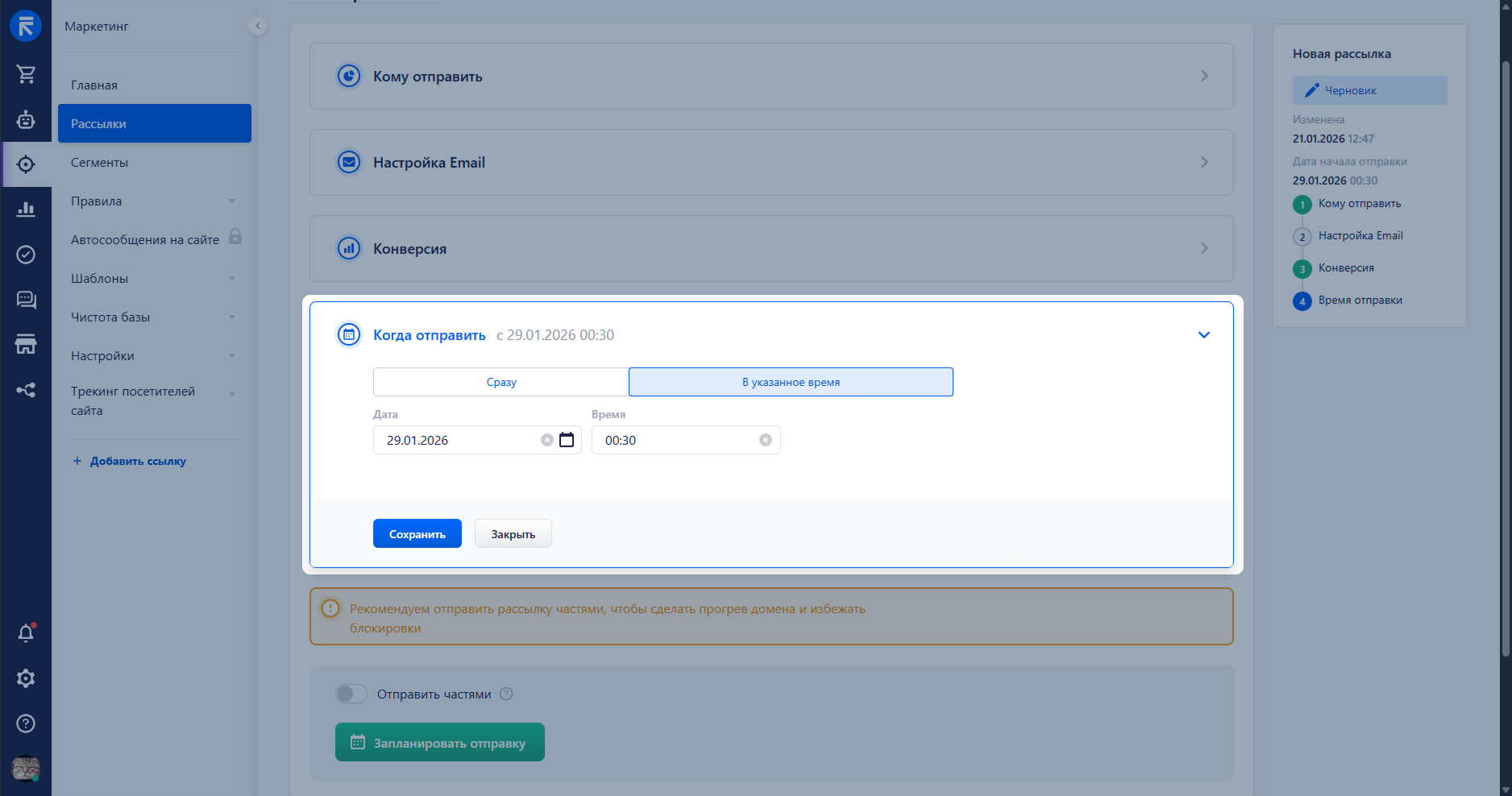 - Сразу — рассылка запустится после нажатия кнопки «Отправить сейчас».