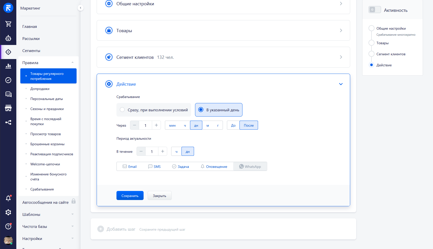 Данный фильтр появляется на втором и последующем шагах при выполнении нескольких условий: выбор действия «Отправить e-mail» или «Отправить SMS», выбор варианта «В указанный день» и указания дней, через которые должен сработать дополнительный шаг.