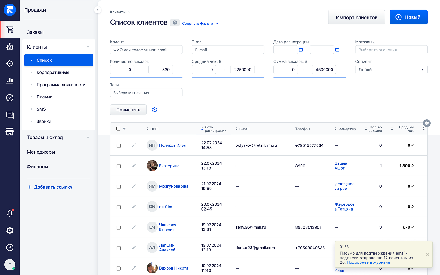 - В карточках клиентов появится статус: Email-подписка не подтверждена.