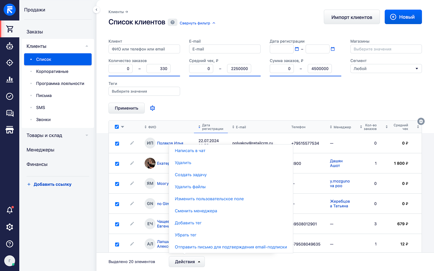 Если в системе есть клиенты с неподтвержденной подпиской, вы можете отправить им письмо для подтверждения массово из списка клиентов. Это действие доступно, если DOI включен хотя бы для одного магазина.