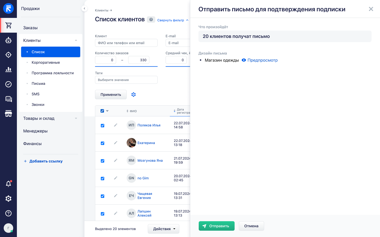 - Перейдите в раздел «Клиенты» и отметьте галочками тех, кому нужно отправить письмо.