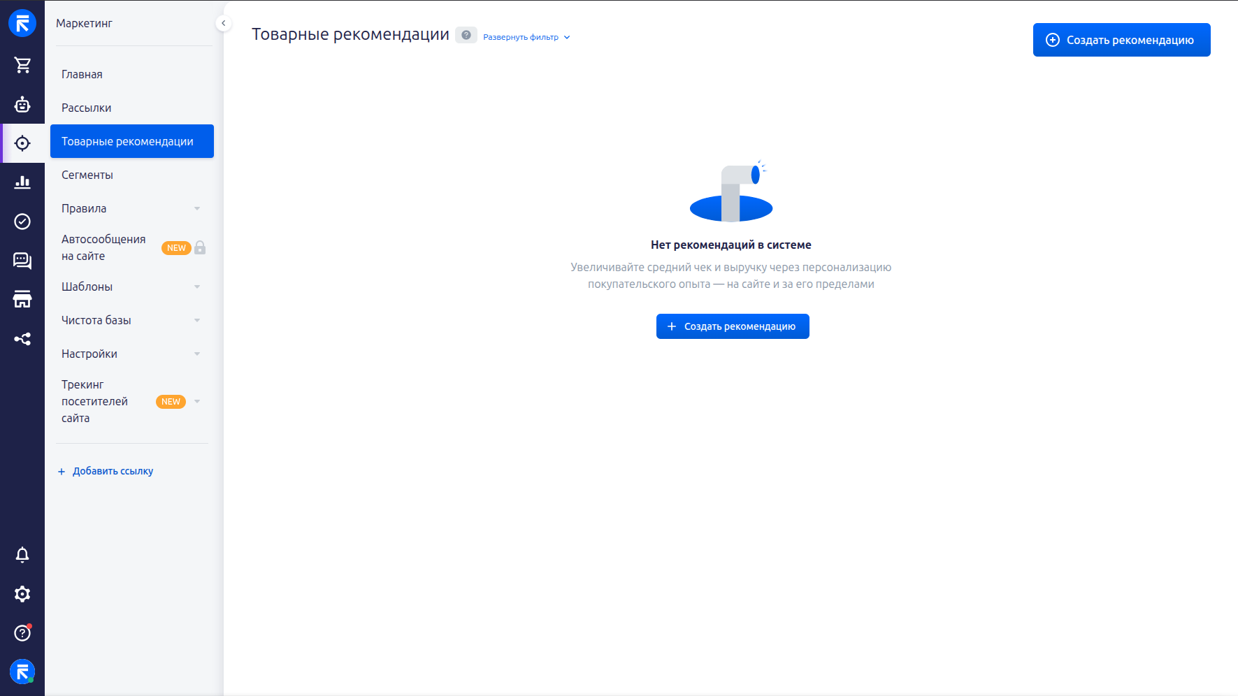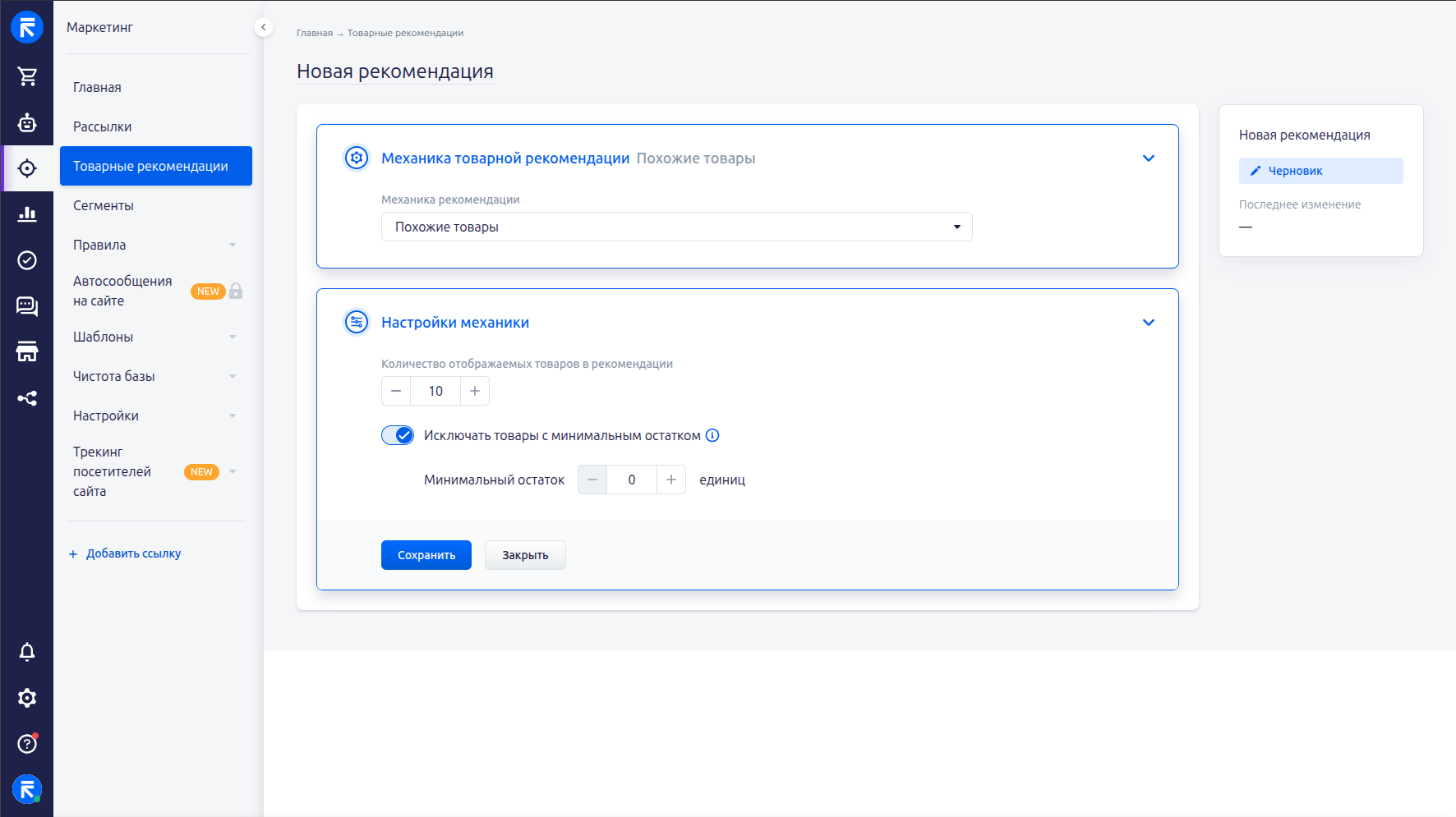 Товарные рекомендации — это отдельный подраздел в блоке «Маркетинг», в котором создаются и настраиваются механики подбора товаров.