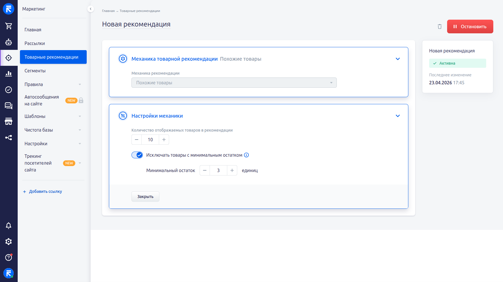 Если для рекомендации включено исключение товаров с минимальным остатком, при редактировании будет доступно поле «Минимальный остаток» с текущим значением.