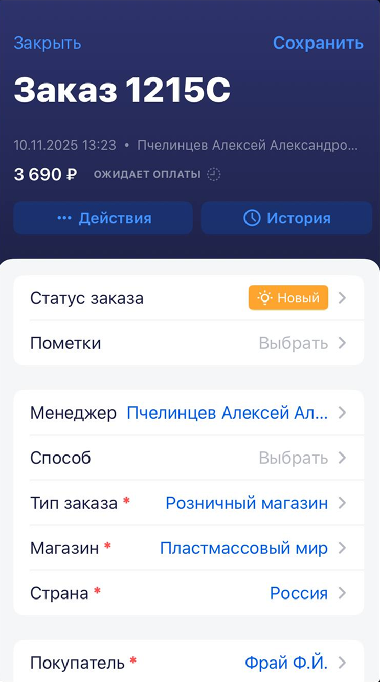 По аналогии с веб-версией карточка заказа в мобильном приложении разделена на функциональные блоки: Основная информация по заказу, Покупатель, Состав заказа и т.д.