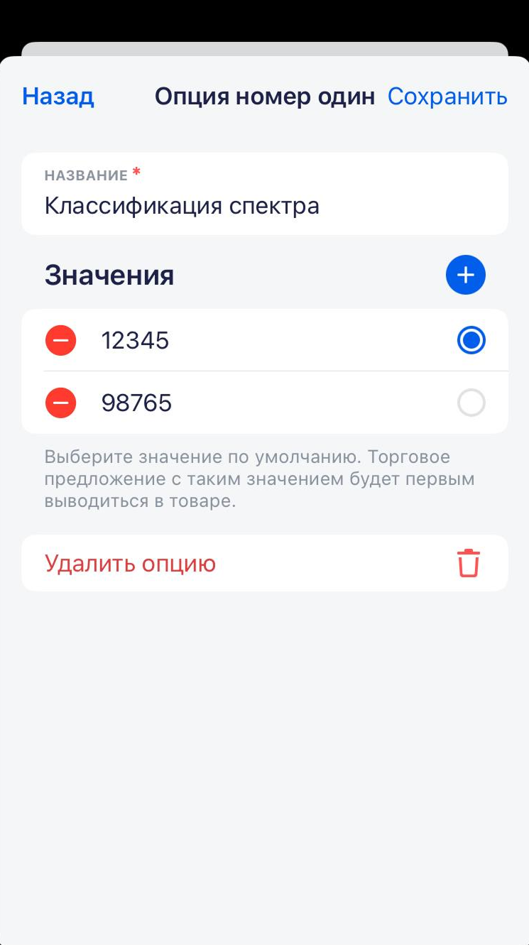 - Добавить значения опции (например, конкретные цвета или размеры).