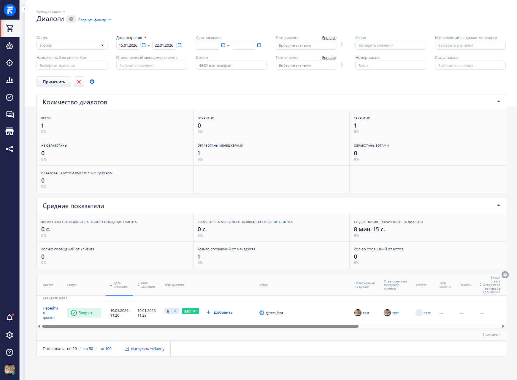 Раздел «Диалоги» предназначен для просмотра истории диалогов с клиентами и анализа конкретных диалогов после фильтрации: можно отобрать нужную выборку, посмотреть сводные показатели по ней и перейти в конкретный диалог.