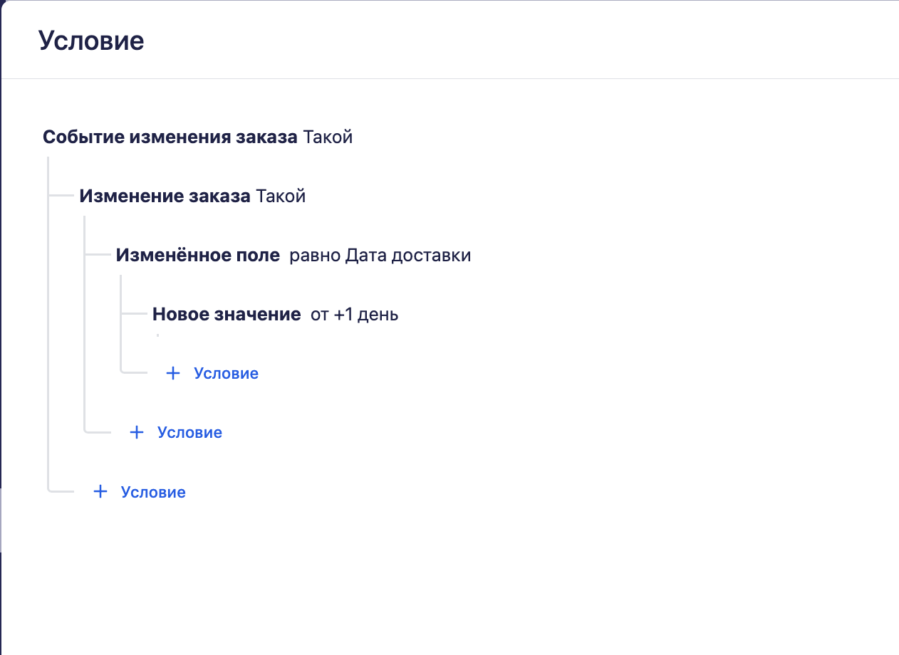 В блоке «Условие» проверьте, что поле «Дата доставки» установлено не задним числом — например, новое значение от +1 день.