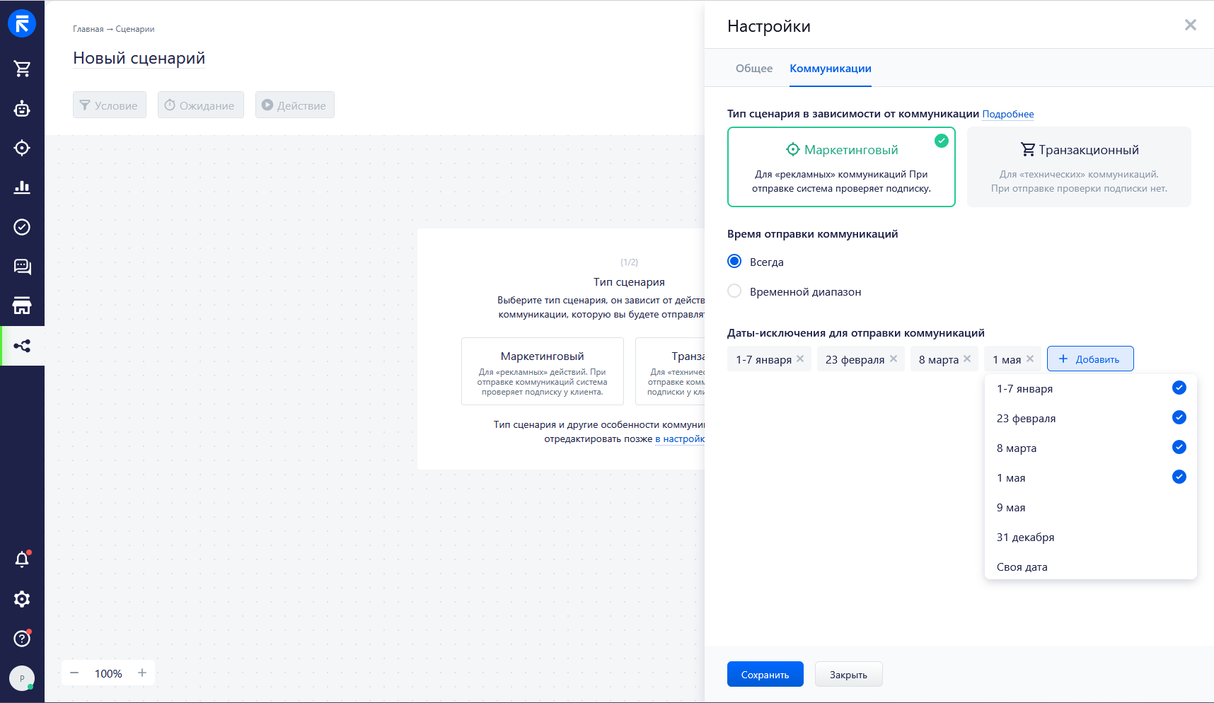 При открытии вкладки «Сценарии» откроется поле для создания сценария действия. Первоначально необходимо выбрать тип «Маркетинговый» или «Транзакционный».