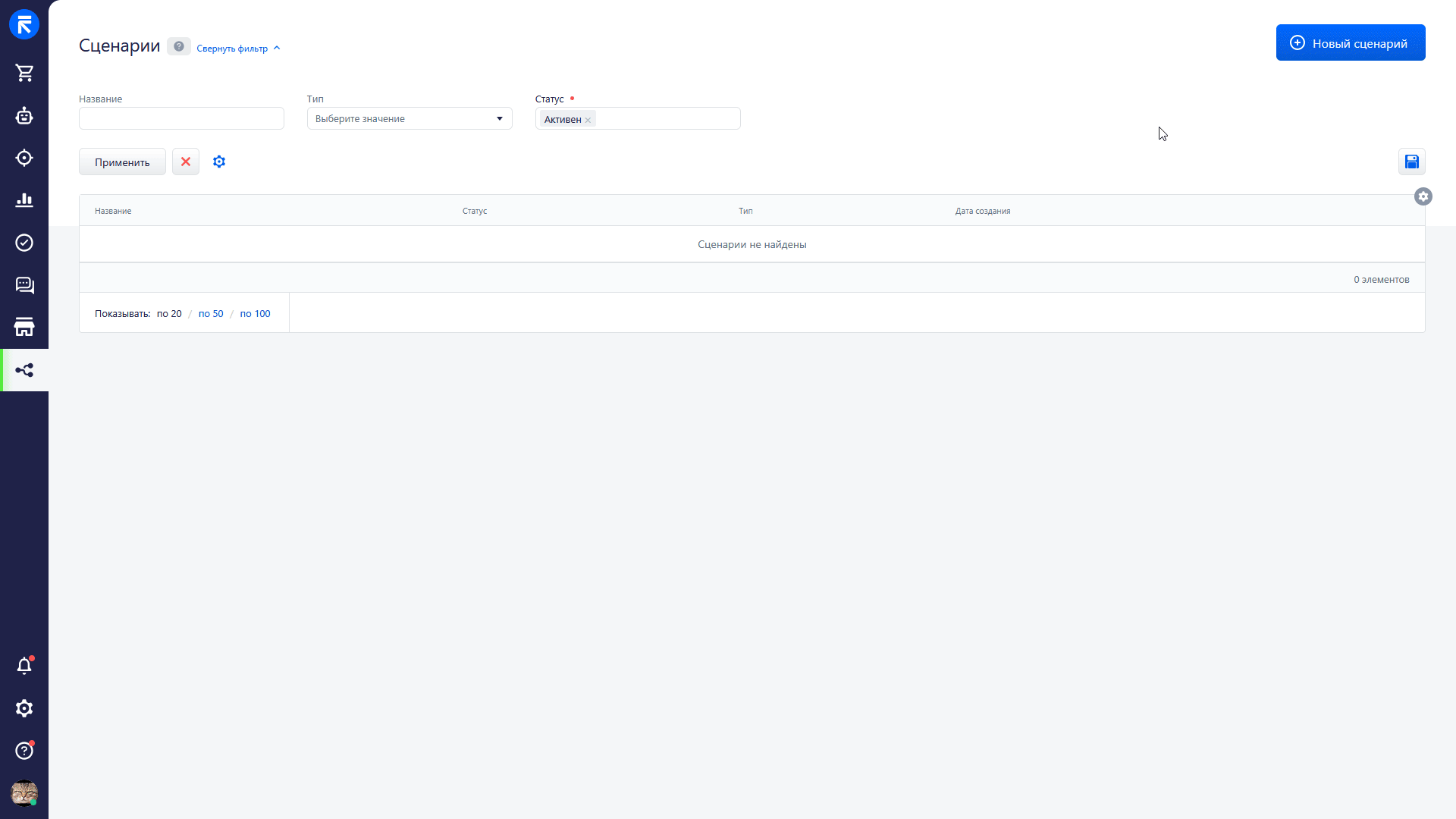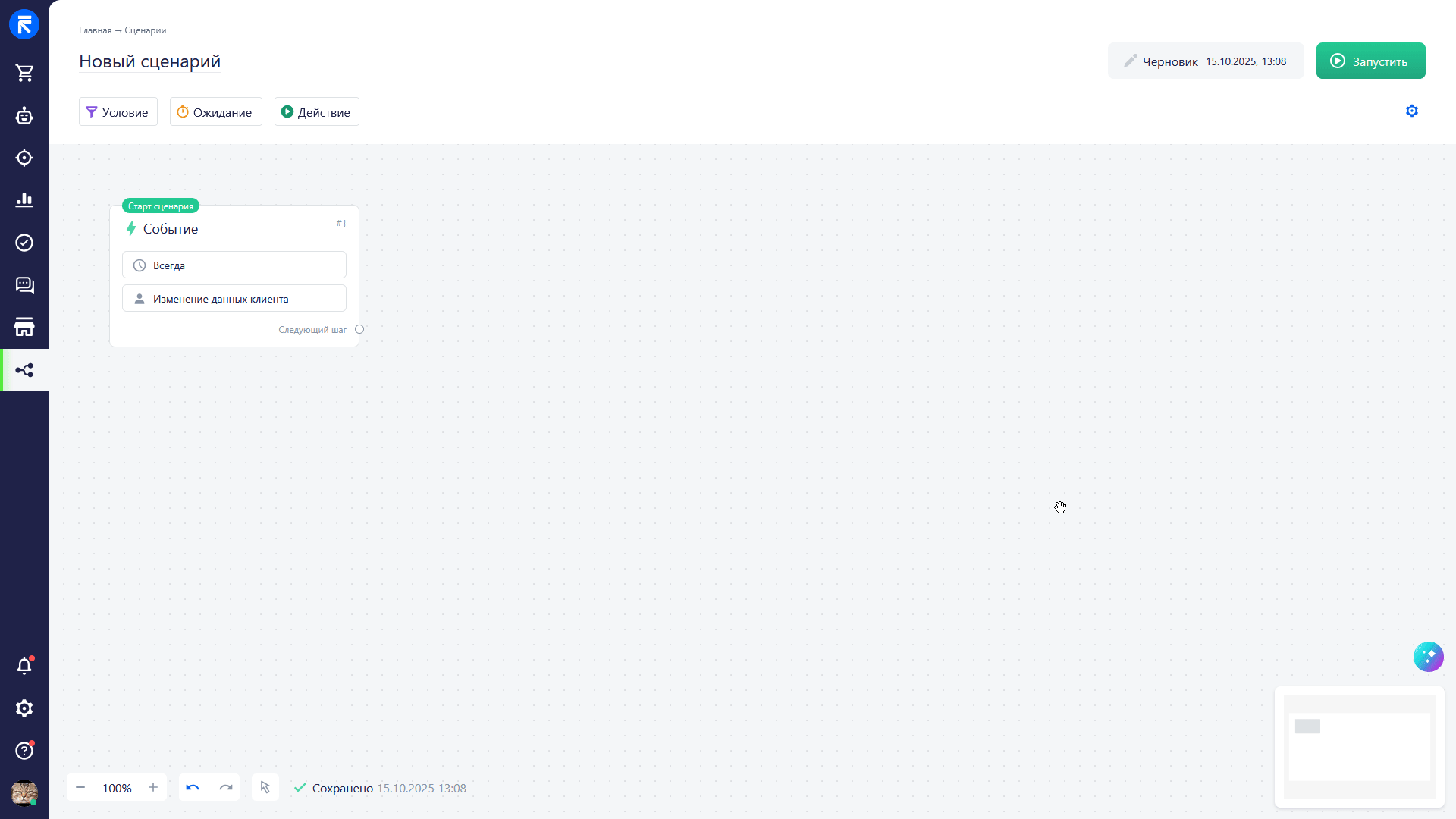 AI-помощник доступен при работе со сценарием. Чтобы воспользоваться им, перейдите в раздел «Сценарии» и начните создание новой цепочки или корректировки уже созданной. В конструкторе появится интерфейс AI-помощника, где вы сможете: